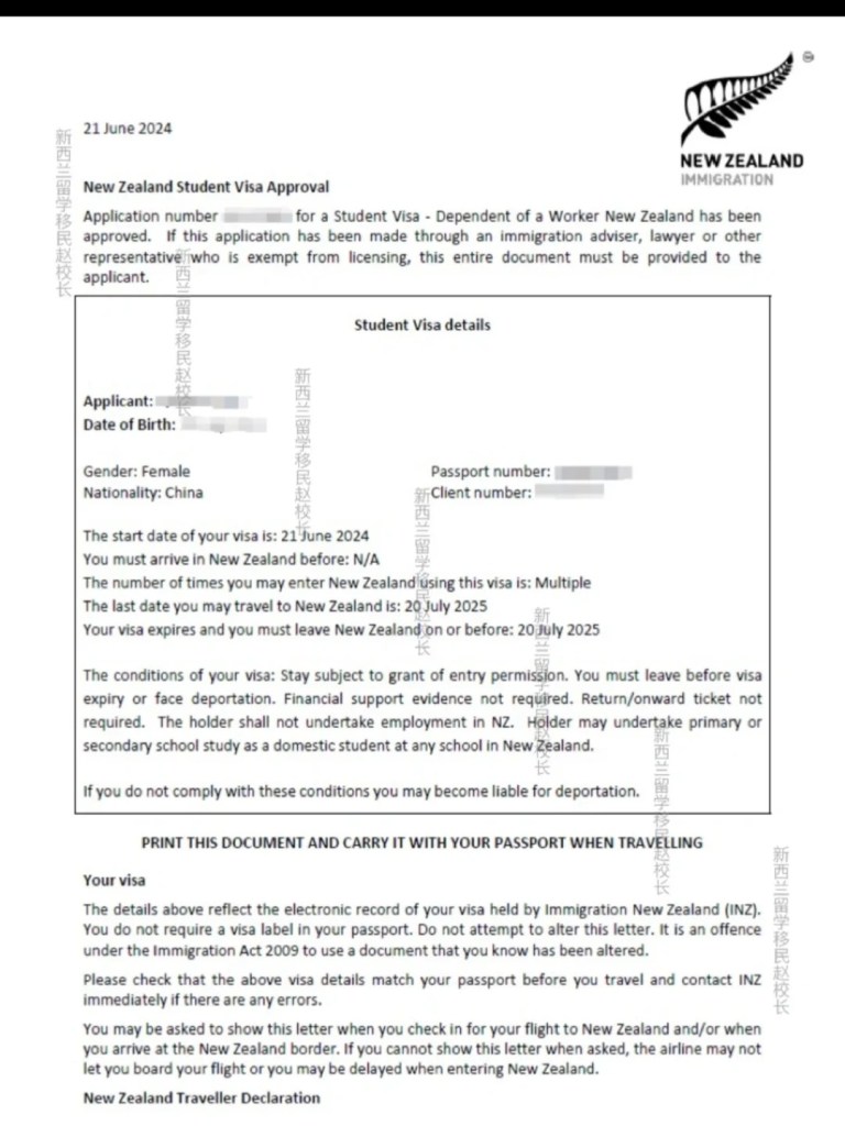 祝贺我们的学生一家三口的签证全部获批。 图上是孩子的学签。 孩子的学签不可以从事工作,可以再新西兰任意小学和中学读书。 孩子的学签需要建立在配偶获得工签的基础上签发。 在这个案例中,母亲是就读幼教,丈夫是配偶工签可以自由工作,孩子免费就读公立小学。 为全家移民成功,迈出了成功的第一步。